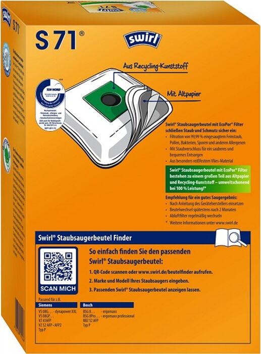 S 71 EcoPor® Staubsaugerbeutel von Swirl® Swirl® Staubsaugerbeutel schließen Staub und Schmutz sicher ein. Bestehend aus besonders reißfestem Vlies-Material, filtern die Beutel 99,99% des eingesaugten Hausstaubs und allergenen Feinstaubs.