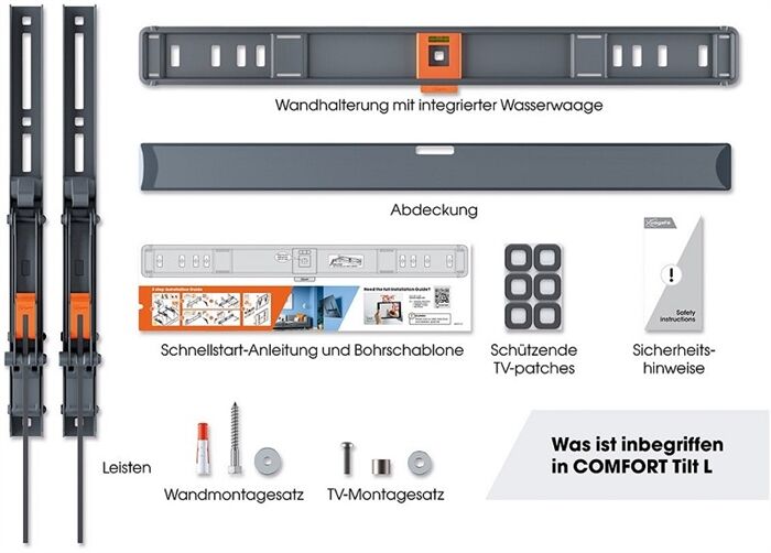 Die COMFORT Tilt TV-Wandhalterung lässt sich ganz leicht installieren. Und Vogel's hilft Ihnen noch weiter. Die Verpackung enthält nämlich auch eine Bohrschablone, Schrauben und DuoPower-Dübel von Fischer®. Mit unserer kostenlosen DrillRight app markieren Sie ganz einfach das erste Bohrloch. Die Wandhalterung verfügt außerdem über eine integrierte Wasserwaage, damit Ihr Fernseher auf jeden Fall gerade befestigt ist. Wie Sie alles installieren, erfahren Sie in der Kurzanleitung zur Installation. Eine detaillierte Anleitung finden Sie online, ebenso wie ein praktisches Installationsvideo.
